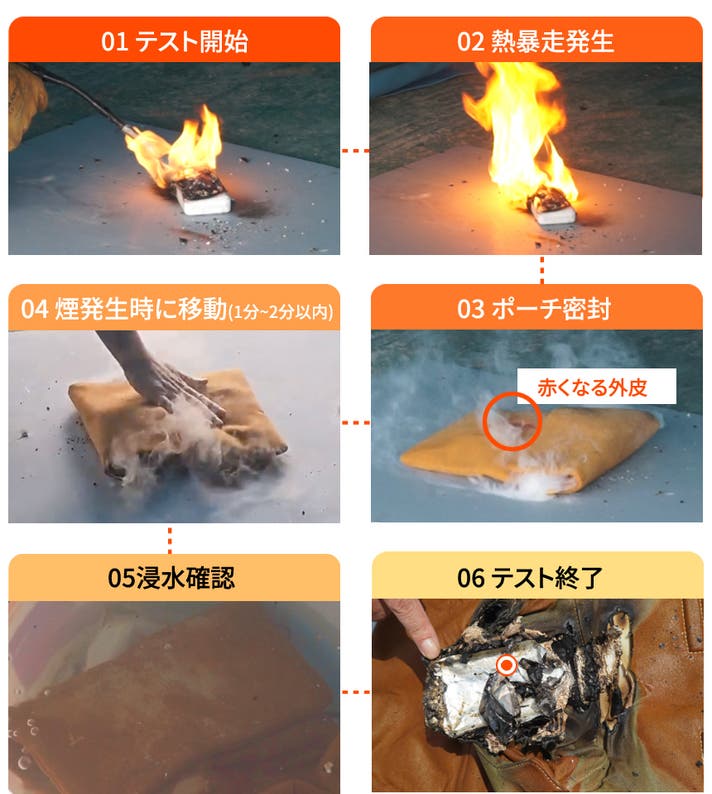 - 厚さ2.2mmの耐火生地と3段生地構造設計でバッテリー熱暴走瞬間温度800℃を備える!