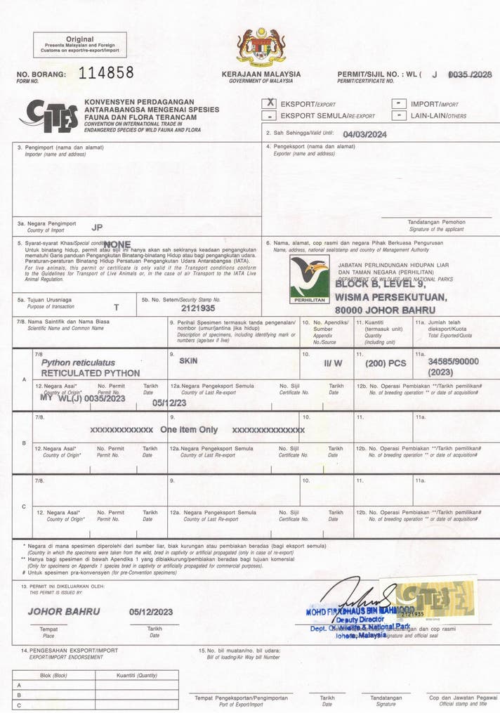当社のパイソン革は、野生生物保護のもとで飼育され、『ワシントン条約=CITES』により適正に輸入された『パイソン』の革となります。