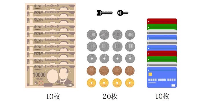 ・お札10枚 ・コイン20枚・カード10枚・領収書など