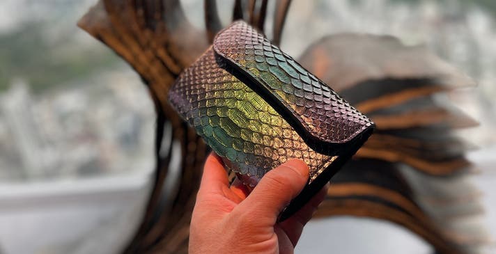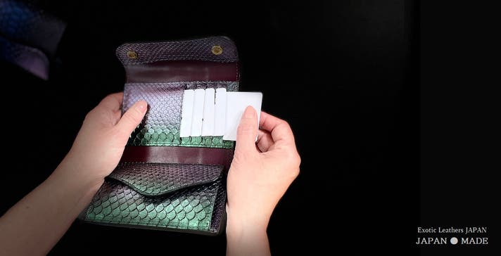 『唯一無二』であることが、本物のパイソン革のお財布を持つ最大の魅力のひとつではないでしょうか。(下写真:虹染グリーン)