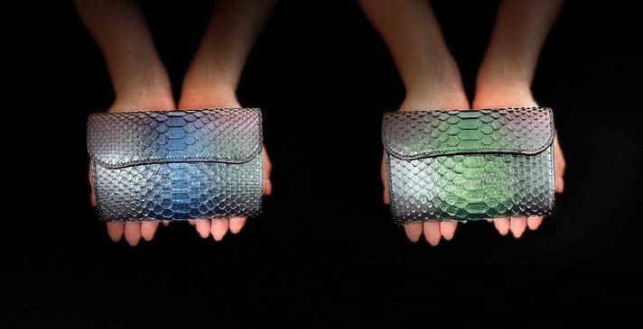 当社のパイソン革は、見る角度や光の当たり方により、全体がパープルからグリーンに変化する特殊な分光性を持った色味を実現しております。