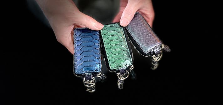 当社では、本物かつ特別な素材であるダイヤモンドパイソンを多くの皆さまにご愛用いただきたいという想いで、一貫生産による高品質で、リーズナブルな商品づくりを心掛けました。