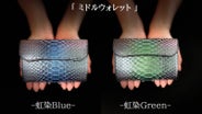 妖艶な外観は、ビジネスのお共や上品なファッションのアクセントにもぴったりです。(下写真:ミドルウォレット 虹染グリーン)