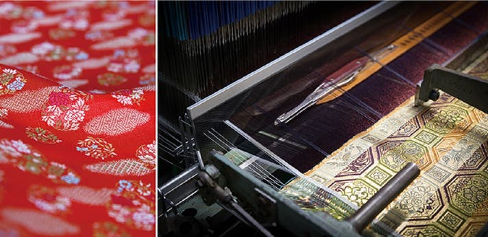 「緞子」とは、ジャガードの一種で、たて糸・よこ糸の色を変えることで、多色の文様を出すことができるのが特徴。金襴と同じく優美な絹の紋織物である。