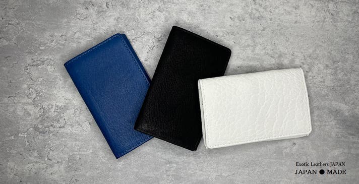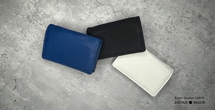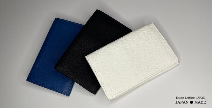 シンプルなデザインと極上な柔らかさを誇るジビエレザーを使用したスリムな名刺入れです。自然なブルー、落ち着いたブラック、清楚な純ホワイトの3色をご用意しました。