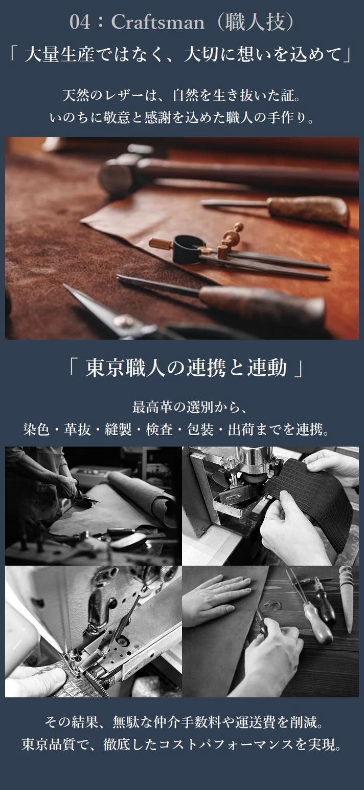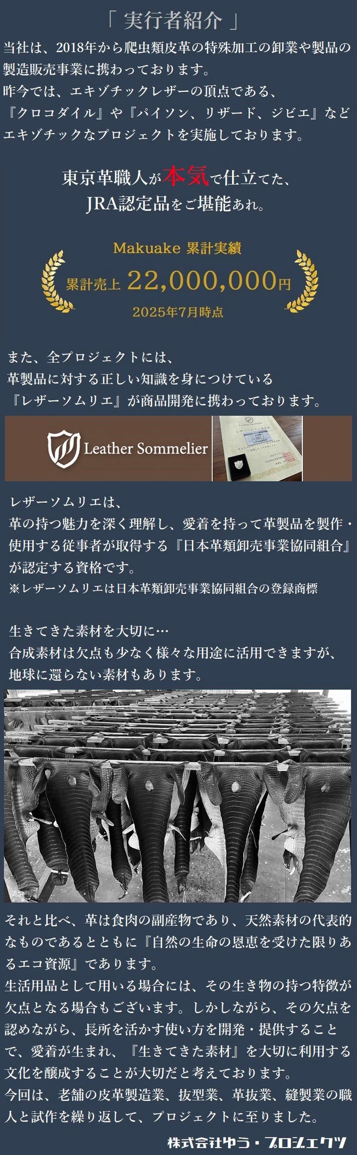*革には個々の個性がございますので、模様や革色にはブレがございます。 *動物の個体により自然にできた傷、トラ(しわ)、シミ、虫刺され跡、血筋痕やムラなどが製品に見られることがございます。 SDGsの観点からもできる限り皮革を余すことなく使用するため、上記の皮革の特徴が入ることがございます。 *日焼けすることもございますので保管時は直射日光を避けてください。 *切断した革の断面は、染色が含浸されていない為、白く見えることがございます。 *ご利用のモニター環境によっては、実際の製品の色合いと異なって見える場合がございます。 *デザイン・仕様は変更になる場合もございます。応援購入者数の状況、使用材料の供給状況、製造工程上の都合等により出荷時期が遅れる場合があります。 *原則として、配送遅延に伴う応援購入のキャンセルはできませんが、リターン配送予定月から2ヵ月を超えた場合には、希望者に限りキャンセルにて対応させていただきます。 *返品は不良品に限り、良品と交換させていただきます。 皆様に喜んでいただけますよう、スタッフ一同心を込めて対応させていただきます。 どうぞよろしくお願いたします。