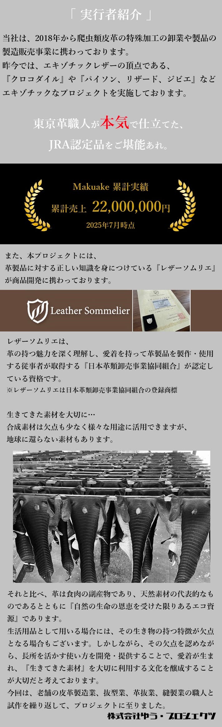 *革には個々の個性がございますので、模様や革色にはブレがございます。 *動物の個体により自然にできた傷、トラ(しわ)、シミ、虫刺され跡、血筋痕やムラなどが製品に見られることがございます。 SDGsの観点からもできる限り皮革を余すことなく使用するため、上記の皮革の特徴が入ることがございます。 *日焼けすることもございますので保管時は直射日光を避けてください。 *切断した革の断面は、染色が含浸されていない為、白く見えることがございます。 *ご利用のモニター環境によっては、実際の製品の色合いと異なって見える場合がございます。 *デザイン・仕様は変更になる場合もございます。応援購入者数の状況、使用材料の供給状況、製造工程上の都合等により出荷時期が遅れる場合があります。 *原則として、配送遅延に伴う応援購入のキャンセルはできませんが、リターン配送予定月から2ヵ月を超えた場合には、希望者に限りキャンセルにて対応させていただきます。 *返品は不良品に限り、良品と交換させていただきます。 皆様に喜んでいただけますよう、スタッフ一同心を込めて対応させていただきます。 どうぞよろしくお願いたします。