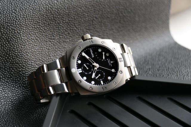 - ケースもベルトも純チタン製のツールウォッチ。宇宙に持っていけるほど軽く、錆や傷にも強い。