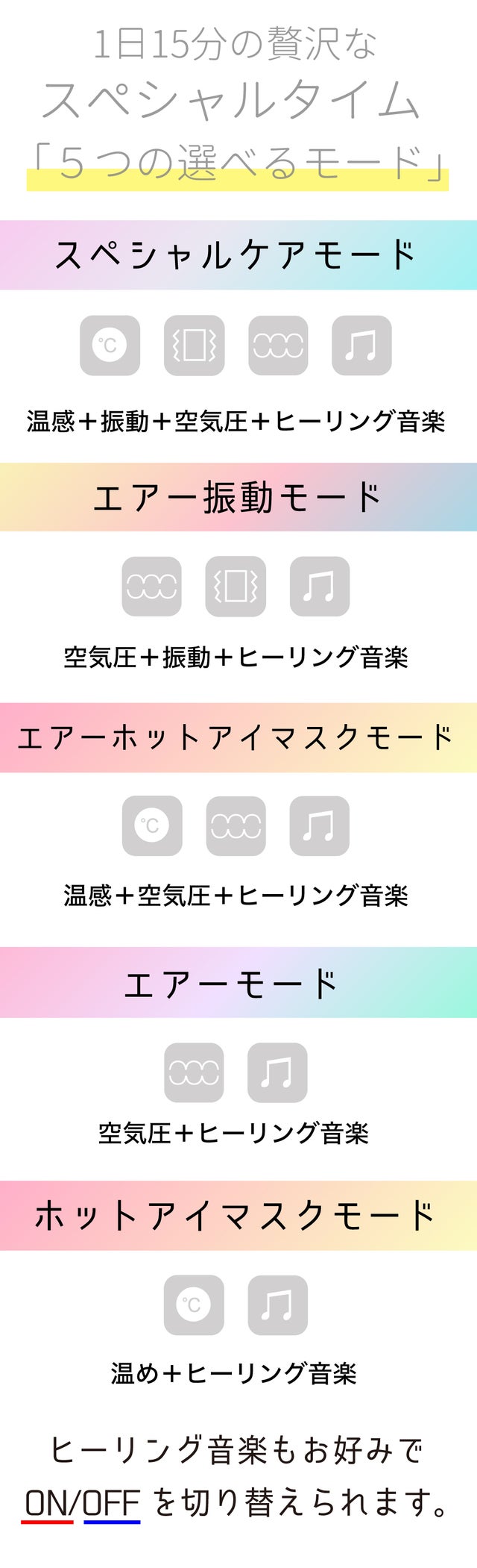 このアイフレッシャーラナは「空気圧」「振動」「温感」「音楽」の4つの機能を搭載しています。