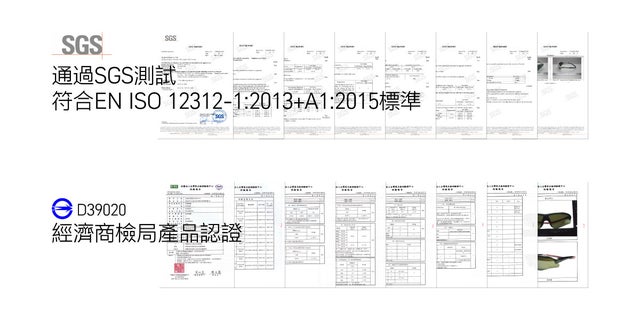 ▲EN ISO 12312-1:2013 + A1:2015規格、および台湾経済省の商品検査局による製品認証D39020に準拠しています。