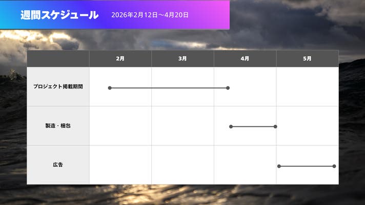 このプロジェクトはAll in型です。目標金額の達成に関わらず、プロジェクト終了日の2026年04月20日までに支払いを完了した時点で購入が成立します。