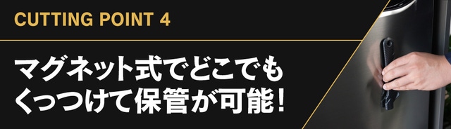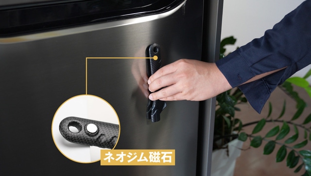 取っ手の背面に強力なネオジム磁石が付いており冷蔵庫、玄関のドアなどの金属表面にピタッとくっつけて保管できます。