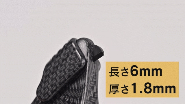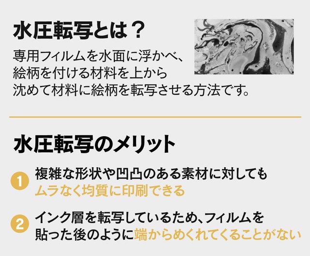 カーボンパターンデザインは水圧転写を採用して特別に仕上げました。インク層を転写しているため、フィルムを貼った後のように端からめくれてくる、といったことはありません。