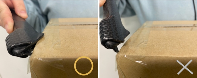 - 正面に切るときは、刃先をテープにしっかりと入れてから引っ張って切ってください。