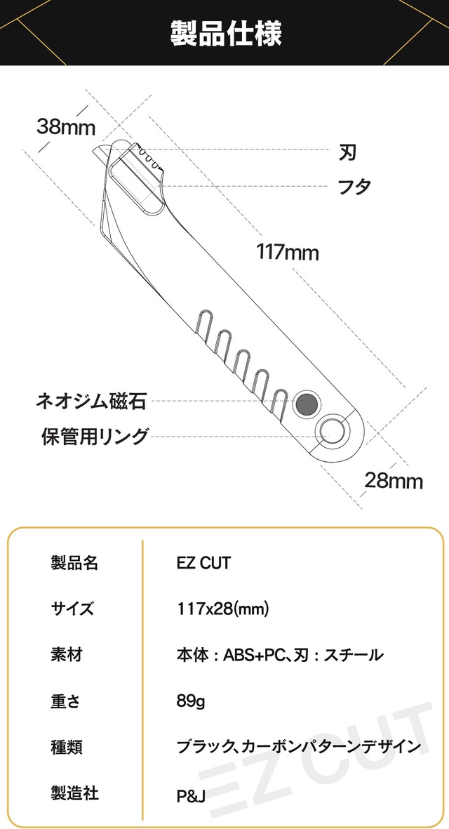 EZ CUTは段ボールの開封とペットボトルのラベルを剥がすのにに最適化されたカッターです。