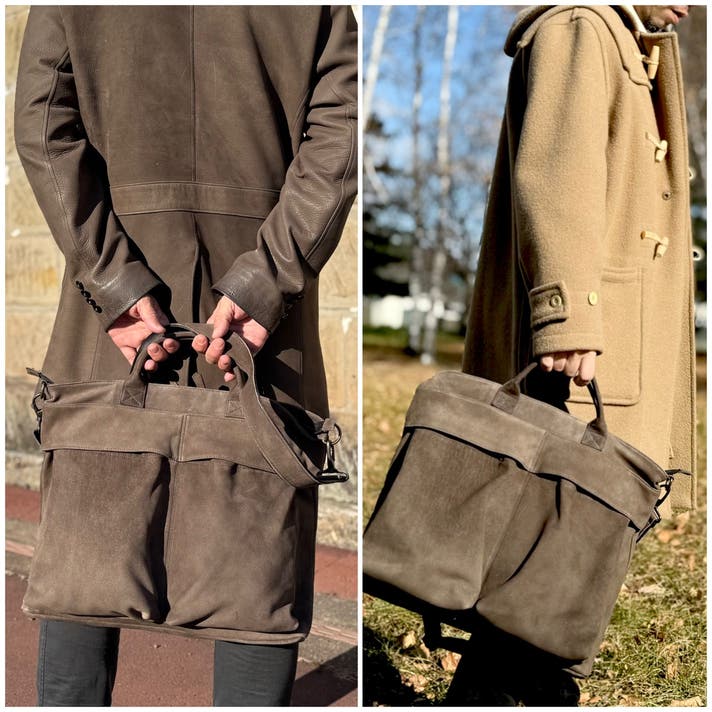 軍用規格をベースとしたヘルメットバッグを、北海道天然エゾ鹿革で仕立てました。