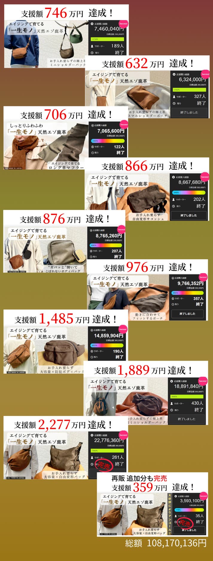 そんな鹿革の魅力を活かした製品は、毎回多くの応援購入をいただいています。ROKUBO×LEATHERECTIONの過去のMakuakeプロジェクト実績です。