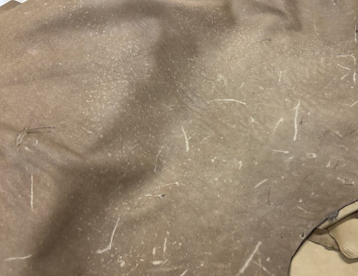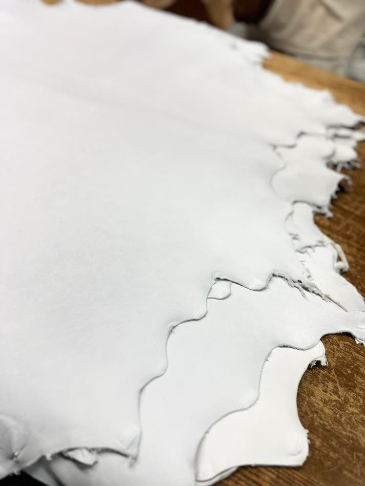 エゾ鹿は個体ごとに皮の大きさ・厚さが異なるため、私たちはその製品(今回はトートバッグ)に最適な原皮(エゾ鹿の皮)を選別し、美しい革になるよう鞣(なめ)しています。