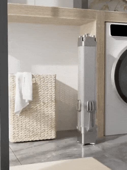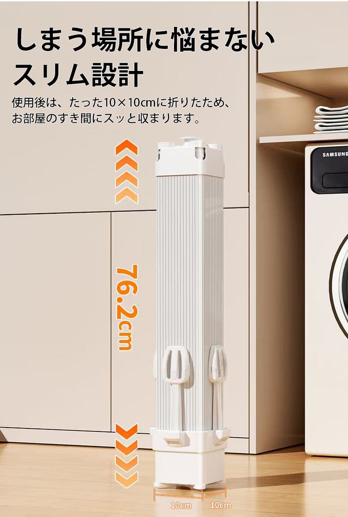 本製品は折りたたむと厚さわずか10cmで、洗濯機の横や家具のすき間にもすっきり収まるスリム設計。