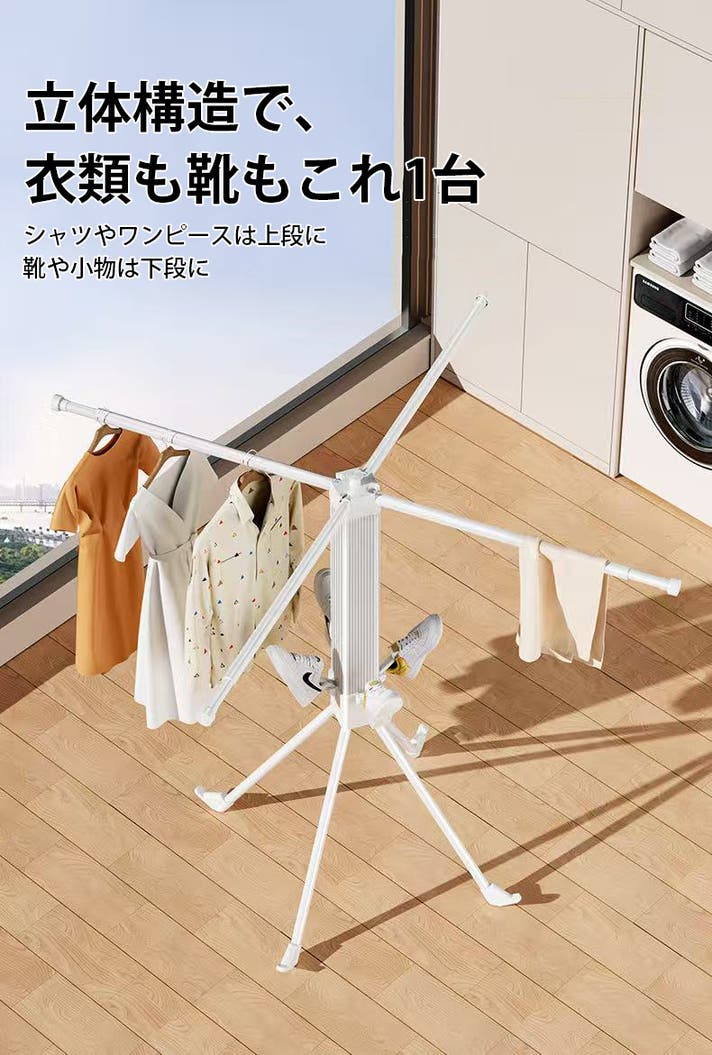 衣類はもちろん、靴専用ホルダーや布団も干せる耐荷重設計を備えているため、これ1台であらゆる洗濯物に対応でき、物干しを使い分ける手間がなくなります。