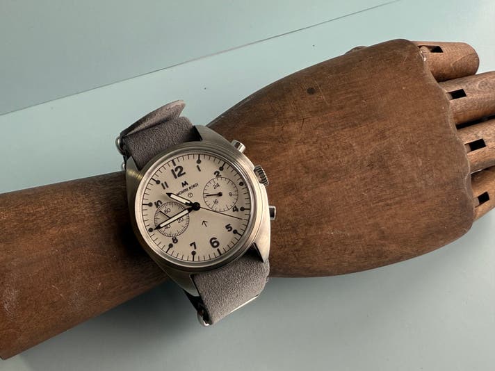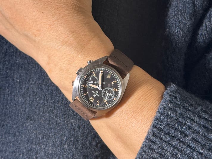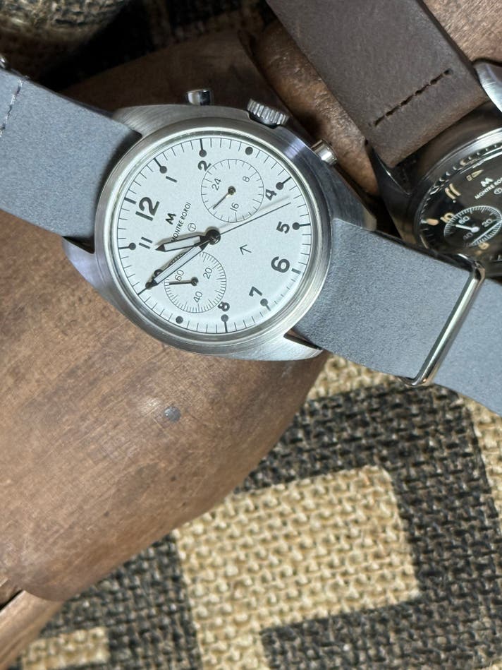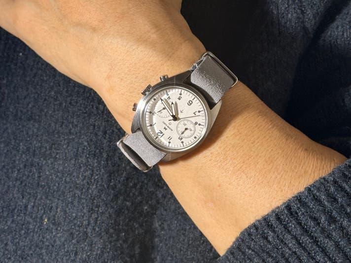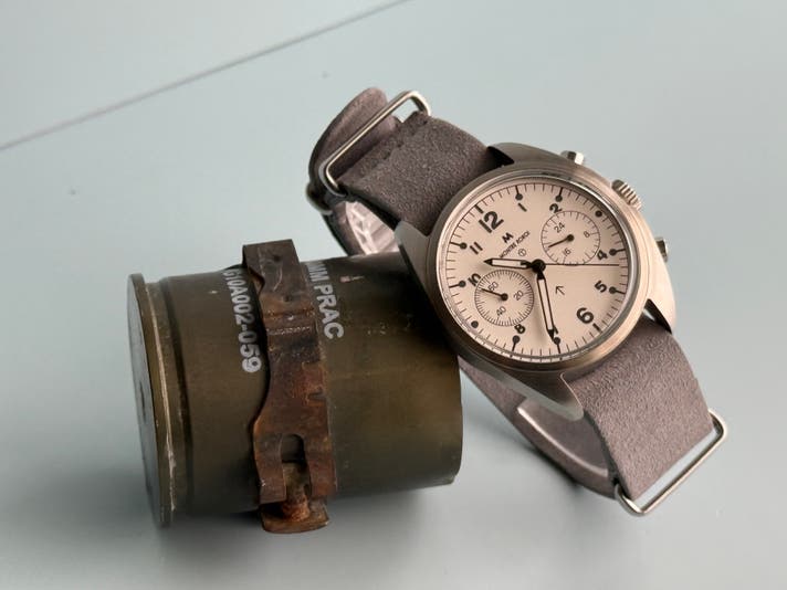 このホワイトシルバー文字盤は、1970年代の英国軍官給クロノグラフに当時、存在しなかった仕様です。だからこそ、私たちはこの文字盤を「オリジナルの再現」だけではなく、ヴィンテージの思想を現代に翻訳する試みとして制作しました。現代の生活に自然に馴染むことも私たちの責任だと考えました。日常の光の中でスーツにも、カジュアルにも特別すぎず、しかし確かに違うそれが、このホワイトシルバーです。
