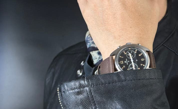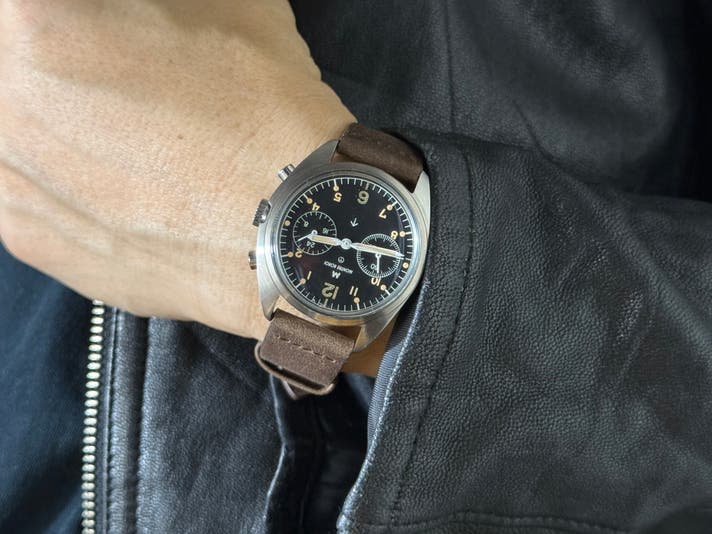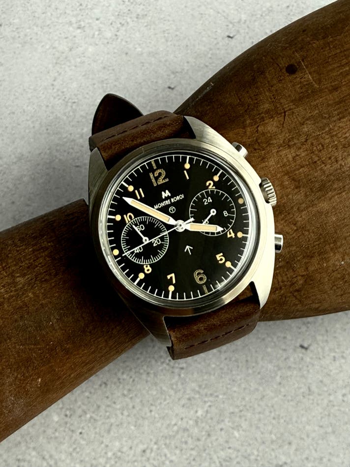 この時計は、“見せるため”ではなく**“使うため”に作られました。マットブラックの反射しない文字盤。一瞬で時間を読み取れるコントラスト直感的に操作できる2プッシャークロノグラフ軍用として信頼された左右非対称ケース