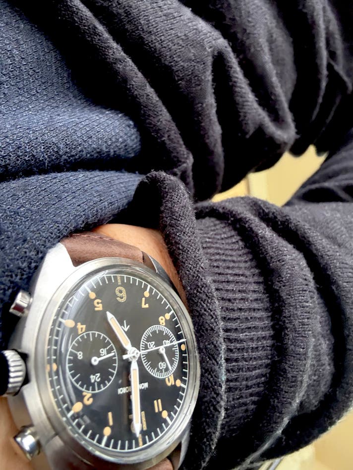 それによって生まれた左右非対称(アシンメトリー)ケースは、単なるデザインではありません。すべて「軍用クロノグラフとしての実用性」からです。デザイン上の遊びや流行では一切ありません。実戦使用を前提に定めた仕様で作られた官給品です。つまり設計思想は常に「極限状況で確実に使えるか」これ一点です。