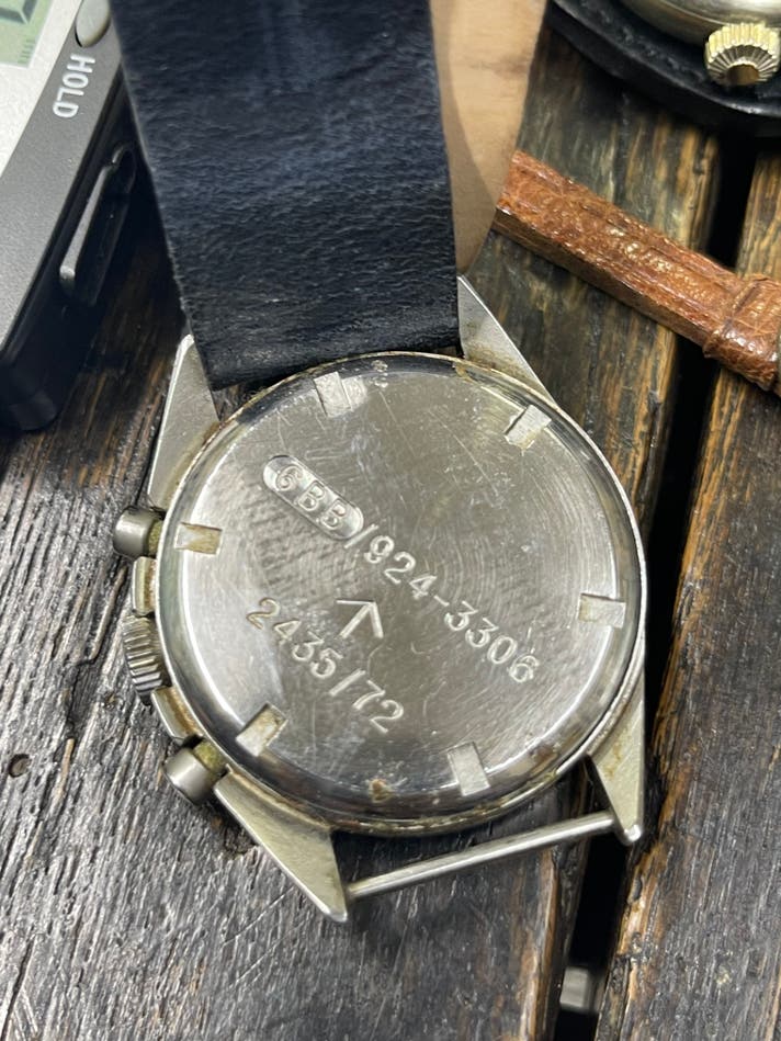当時のオリジナルと同じくステンレス製回転式の裏蓋を使用します。現在裏蓋のデザインは協議中の為、変更の可能性はありますが、英国政府所有のブロードアローと空軍(RAF)を表す6BBに、fabfourのモデルナンバーである924-3306を刻印する予定です。この写真はオリジナル時計の裏蓋で6BBの部分が掘られています。これは0552海軍(Royal Navy)と刻印されたものを消して、空軍配給に充てる為に刻印しなおした跡になります。二本線で消している個体もあるようです。