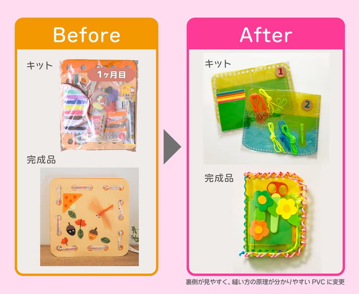 2024年のPVCの試作品が完成、名古屋短期大学桜花学園大学附属幼稚園でモニターを募集し、1・2か月目のキットを体験していただきました。