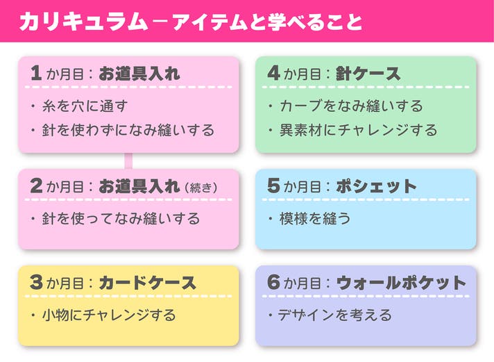 - 必要な材料はすべて届くため準備不要。6か月間取り組めるキットで裁縫の基礎が学べます。