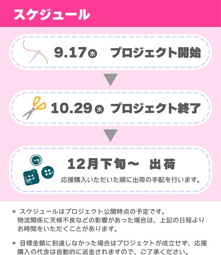 本文中に記載させていただいたスケジュールは、あくまでプロジェクト公開時点の予定です。 材料の調達状況により、お届け品の色や素材などの仕様が変更になる可能性があります。 応援購入の性質上、配送遅延のおそれがございます。 原則として、配送遅延に伴う応援購入のキャンセルはできませんが、 リターン配送予定月から3ヶ月を超えた場合には、希望者に限りキャンセルにて対応させていただきます。 ◆交換条件について 商品の不具合があり、以下の条件の場合は良品との交換を承ります。 ・商品到着後7日以内にご連絡いただいた場合 ・商品が未使用であること(ただし、不具合確認のための開封は除く) ・商品に初期不良や注文内容との不一致がある場合 交換にかかる送料は当方が負担いたします。