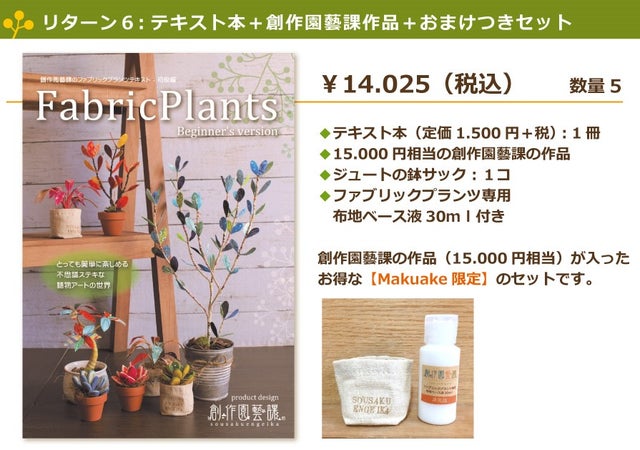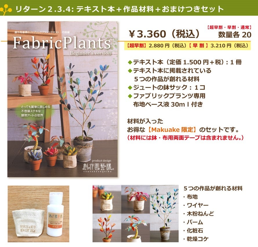 「Makuake(マクアケ)」は、実行者の想いを応援購入によって実現するアタラシイものやサービスのプラットフォームです。このページは、 アート・写真カテゴリの 「新しい手芸アート「枯れない植物・ファブリックプランツ」のテキスト本を作りたい!」プロジェクト詳細ページです。