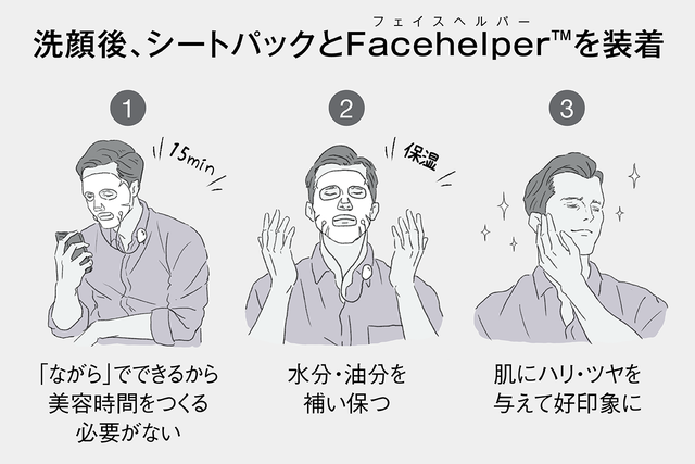 使い方は、至ってシンプル。洗顔後にお持ちのシートパックを貼り、その上からFacehelper™を装着するだけ。
