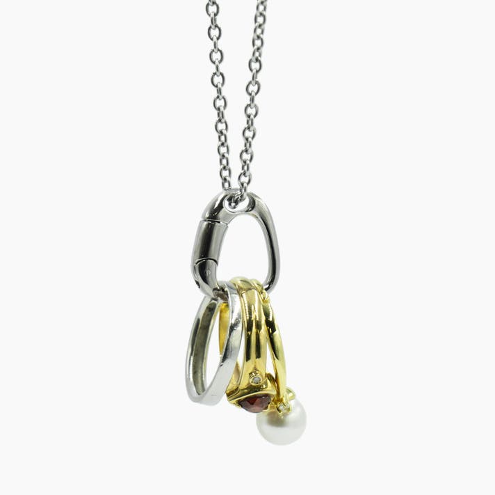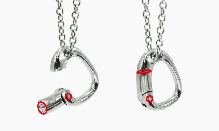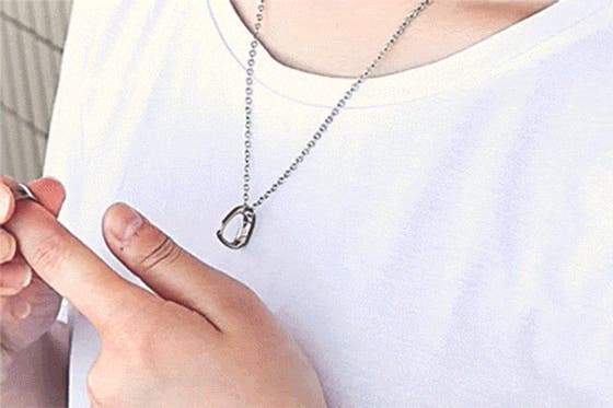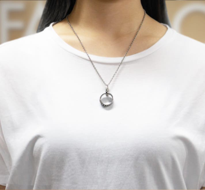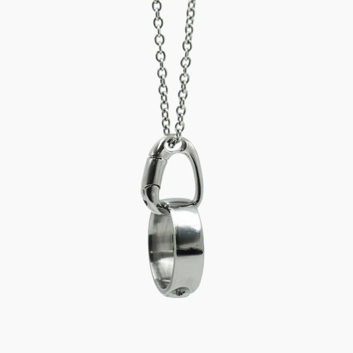 首にかけたままで手軽にカチッとリングを着脱。