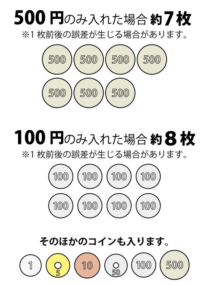 500円硬貨で7枚、100円硬貨は8枚収納。その他のコインも入ります。