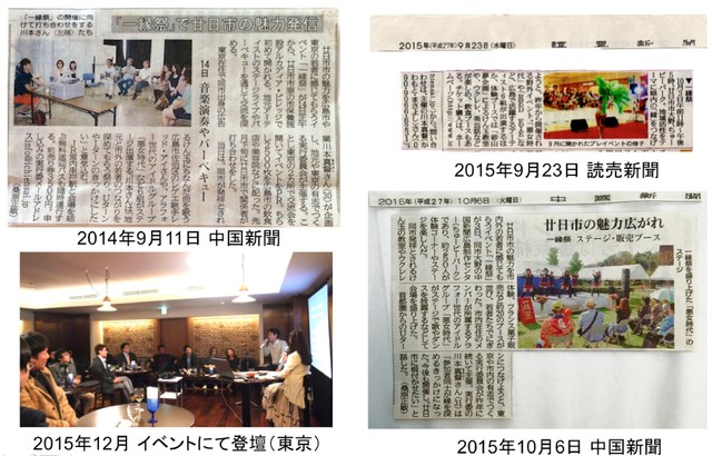 またその傍ら、生まれ育った広島の魅力を発信し、観光や移住の促進をカタチにしたいと考えるようになる。この想いがキッカケで、2014年より関東と広島の2拠点活動をスタート。資金・経験・人脈なしの状態から、野外フェス” 一縁祭 “をプロデュースし、各種メディアに取り上げられるイベントまで成長をさせてきた実績を持つ(2014年・2015年開催)。