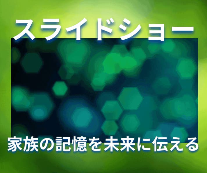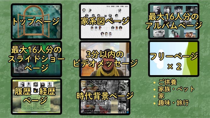 ④スライドショーページ―ご家族の写真を50枚までで、家族全体のスライドショーを1ページ作成いたします。