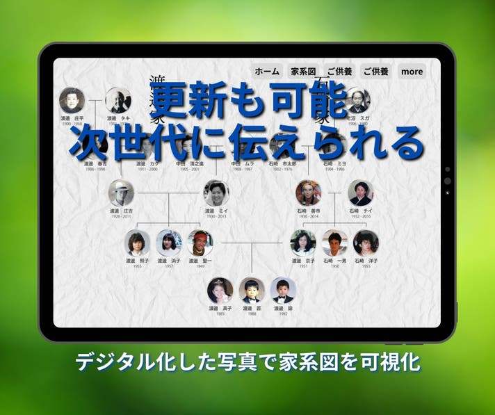 - 古い写真をデジタル化し視覚的に捉えた家系図を作成し、次世代に引き継げるサービス
