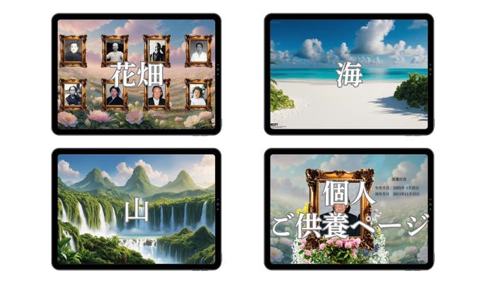 ご供養ページのアイコンをクリックすることで、ご供養のトップページが表示されます。ご供養ページの背景は【花畑】【海】【山】からお選びいただけます。