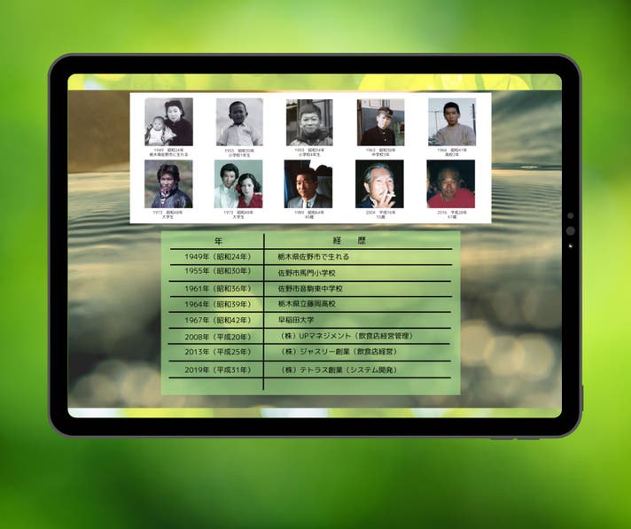 デジタル家系図の写真をクリックすることで、アルバムとスライドショーを展開。家族のエピソードを語り合い次世代に引き継ぐ資料となります。操作は簡単、一般的なホームページを閲覧するのと同じ。