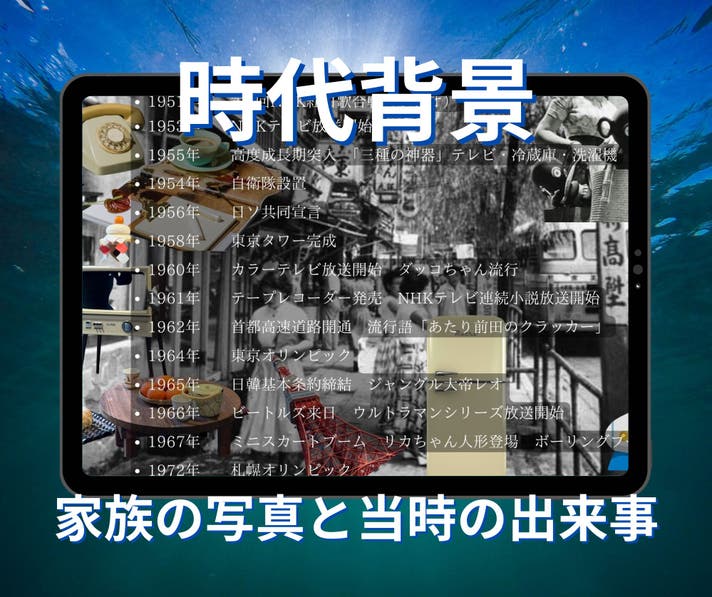 アルバムに時代背景ページを挿入することで、ご家族がどんな時代を過ごしてきたか、時代と状況を語り継げる資料を一緒に残すこともできます。(スタンダードプランとスペシャルプラン)