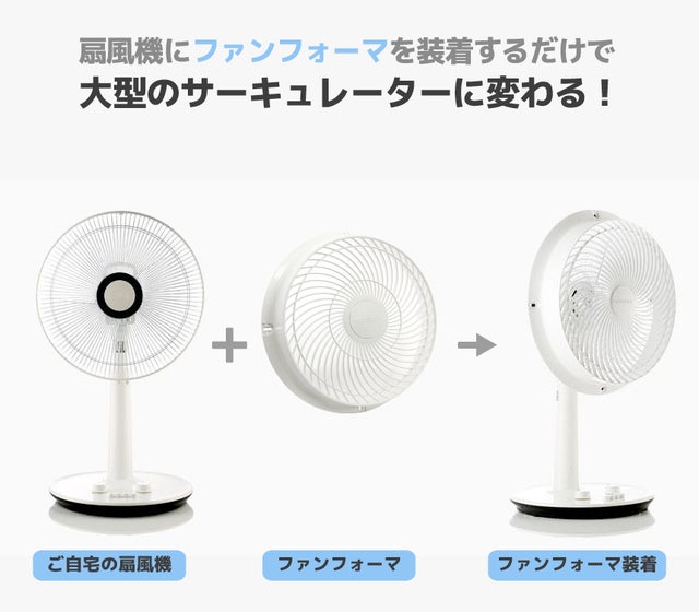 「ファンフォーマは扇風機をサーキュレーターに変身させるKITです。扇風機のカード部にファンフォーマを装着するとすぐに大型サーキュレーターに変身します。