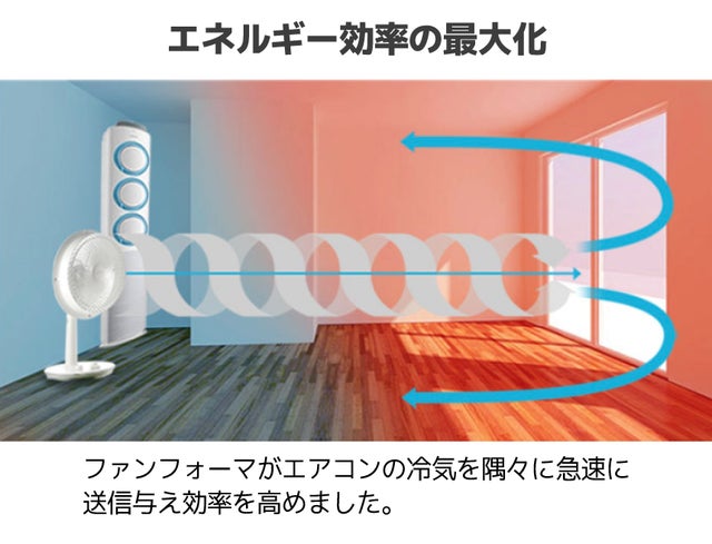 ※ファンフォーマは風速を強めなくても風速を増加させるので、騒音を低減し、エネルギーも節約することができます。(ファンフォーマ装着前と装着後の騒音の変化はありません。)
