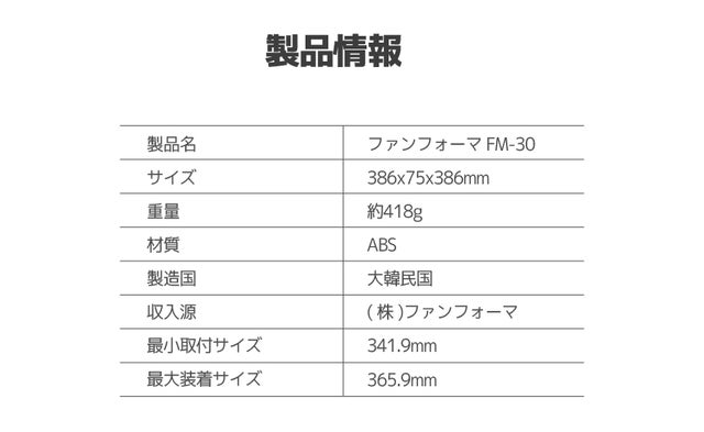 ファンフォーマは扇風機の前面ガード部を取って装着するため、ファン(羽根)のサイズ確認は非常に重要です。日本国内のほとんどのファン(羽根)は、12型(30cm)ですが、たまにサイズが異なる場合があります。サイズを確認した後、ご購入してください。