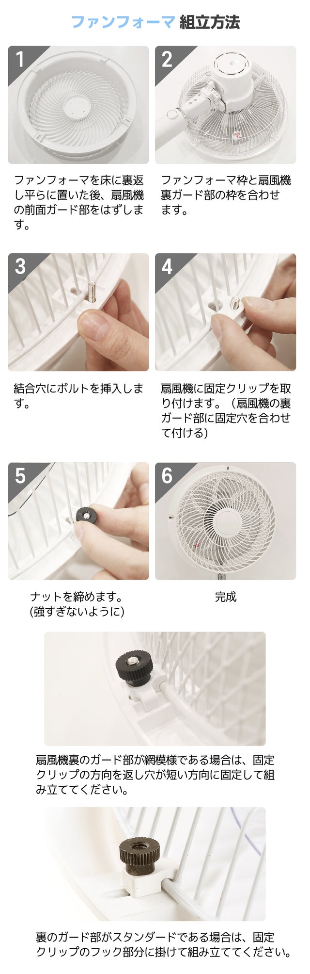 ※ファンフォーマを装着の際にカーペットや毛布の上で置いてつけると滑りにくくてより装着しやすいです。