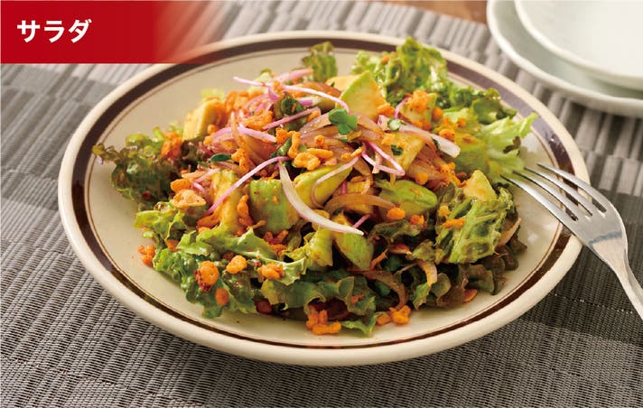 生野菜にたっぷりとふりかけ、仕上げにごま油をひと回し。コチュジャンベースの「即席チョレギサラダ」風味が完成。野菜嫌いのお子様でもバリバリ食べられる、魔法のドレッシング代わりに。