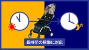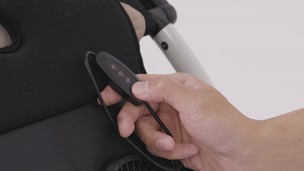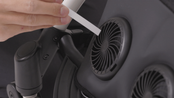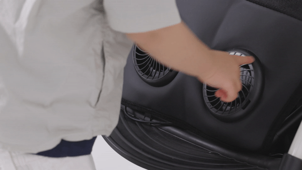 送風ファンがベビーカーやチャイルドシートと体の間に快適な風を流す事により、お尻や背中・首元・後頭部が蒸れにくい状態を作り出します。