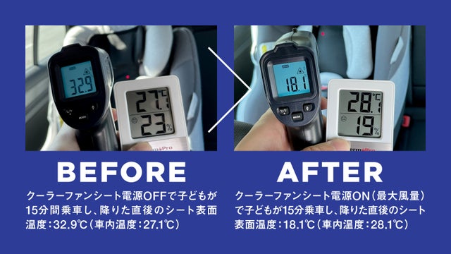 Before:クーラーファンシート電源OFFで子どもが15分間乗車し、降りた直後のシート表面温度:32.9℃(車内温度:27.1℃)