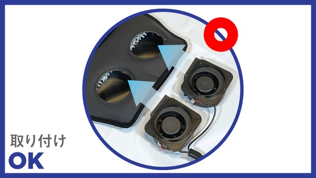 風の吹き出し方向がシート側に向いてるため、効率よく風を送り込めます。 また、音が静かなファンを採用しているため、ファンを2つ搭載していても静か。