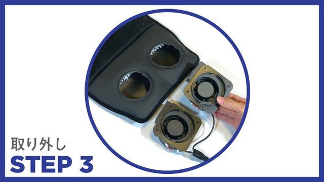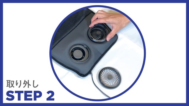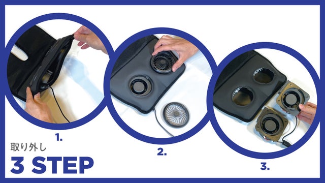 シートを洗濯機で丸洗いすることができます。ファンの取り外しはたったの3ステップ。